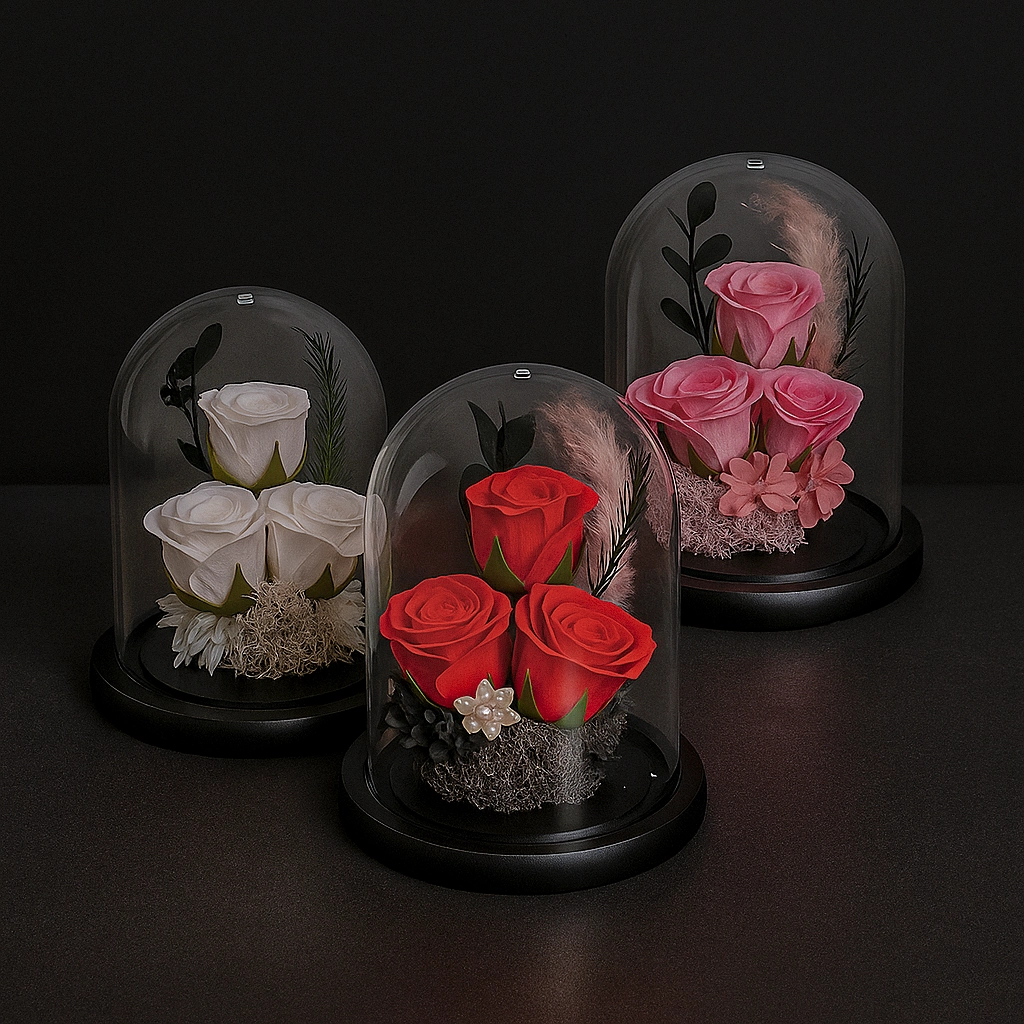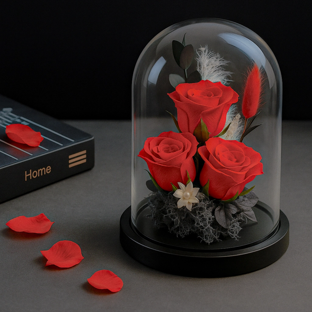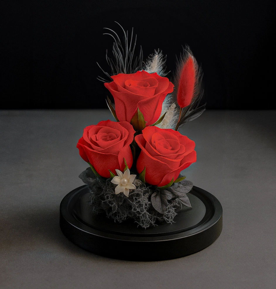 Před vámi je Premium trojitá červená růže v kopuli – dokonalý dárek, který okouzlí svou elegancí a výjimečností. Zapomeňte na květiny, které za pár dní uvadnou. Tato úžasná kompozice tří červených růží v ochranné skleněné kopuli si zaslouží místo v každém domově.