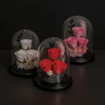 Tři dokonale aranžované červené růže v ochranné skleněné kopuli vytvářejí impozantní a romantický vzhled. Zapomeňte na květiny, které za pár dní uvadnou – tato věčná krása nevyžaduje žádnou péči.